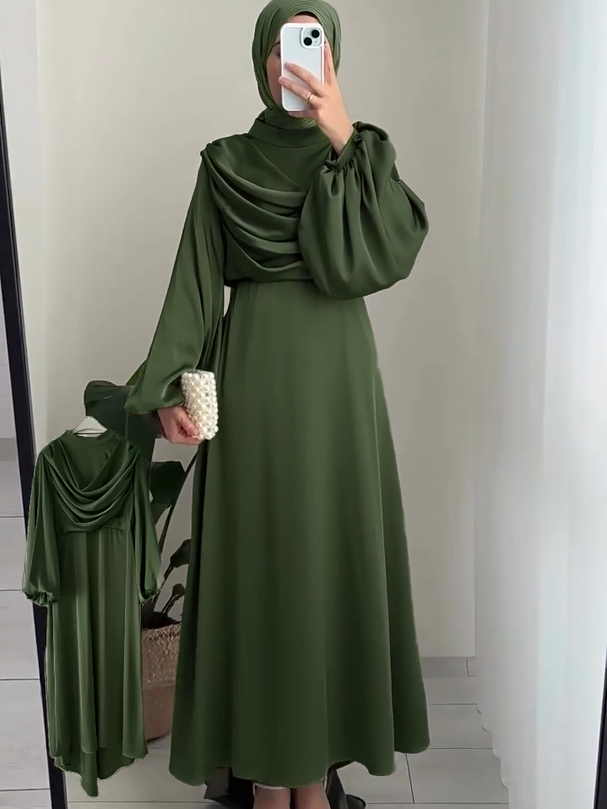 Satin Bubble Sleeve Stacked Neck Dress