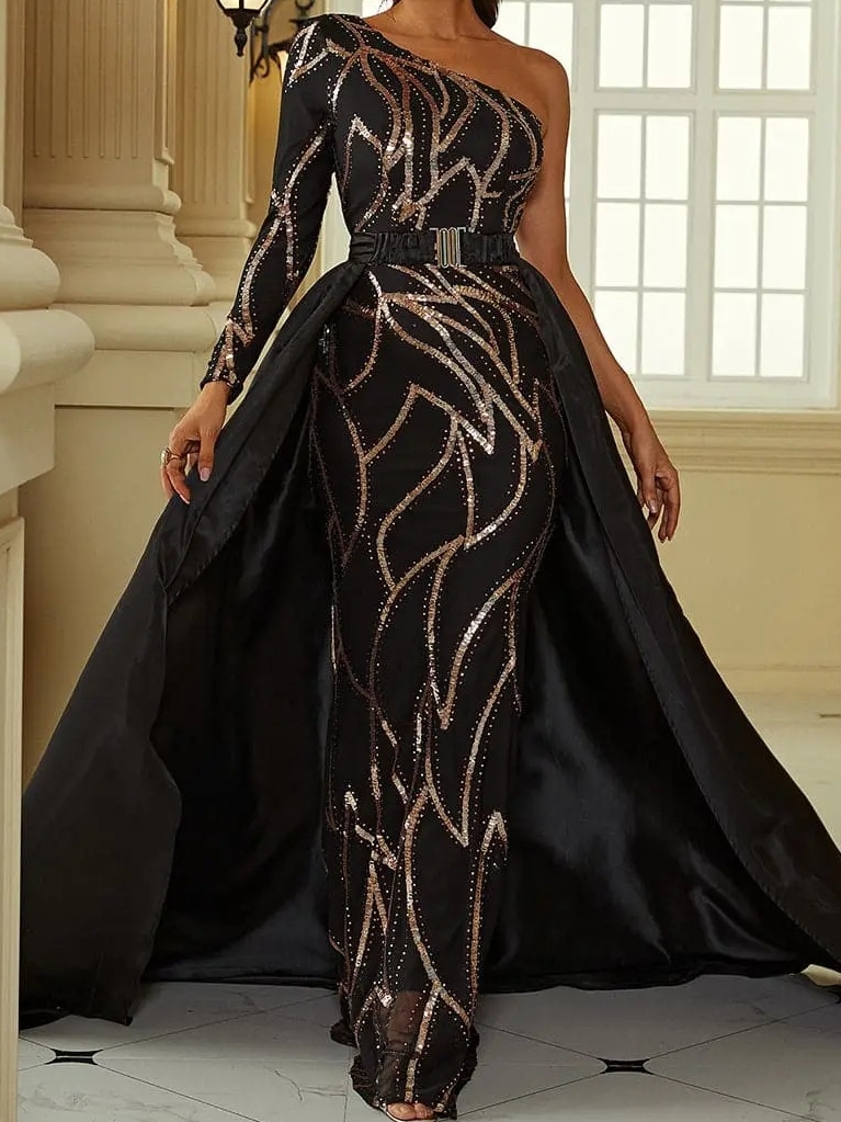 Solid Color Sequins Mid Waist One Neck Dress