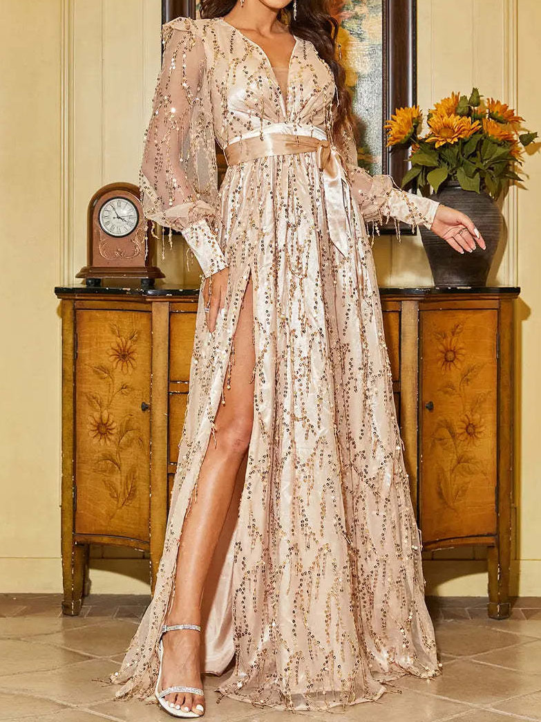 Sequined Lantern Sleeve Party Dress