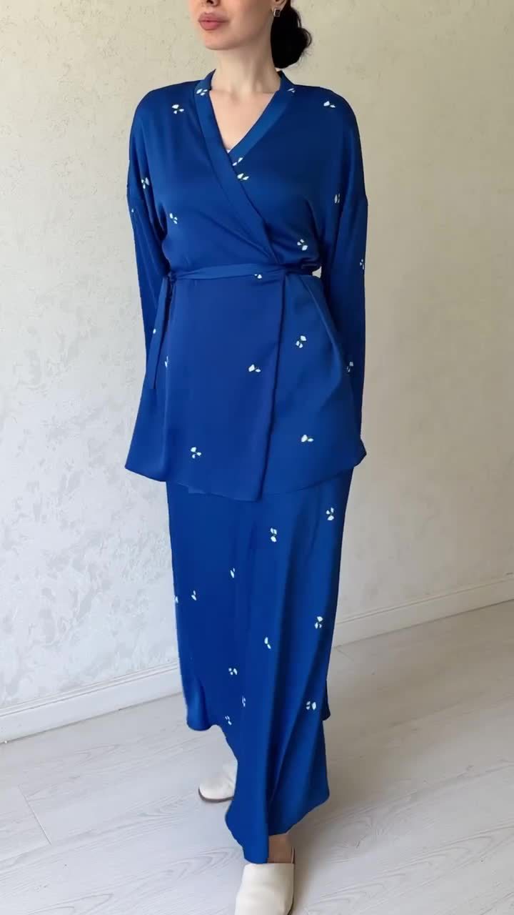 2pcs Printed V-Neck Waist Slimming Draped Satin Dress Set