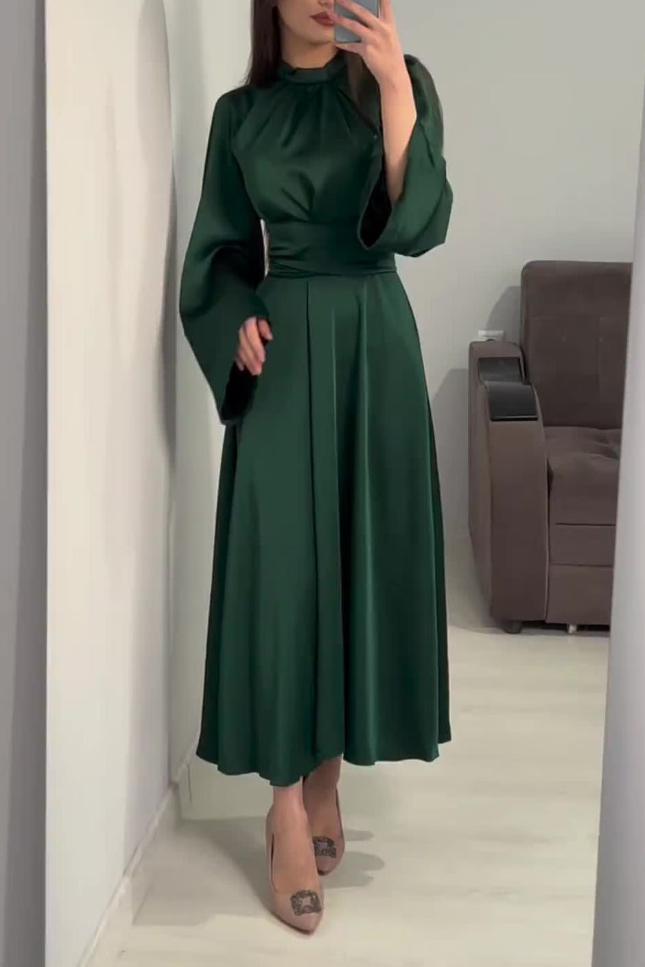 Elegant Pleated Trumpet Sleeve Midi Dress