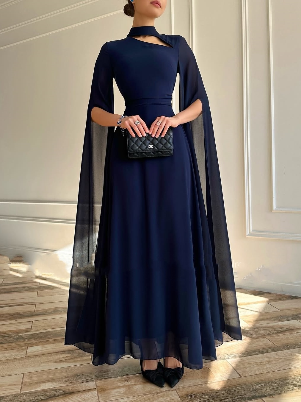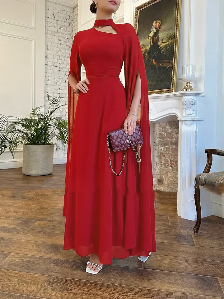 Details: The cape-style chiffon sleeves seamlessly blend into the skirt, creating a smooth transition without any abruptness. The slim-fit design precisely follows the body, emphasizing the waistline and optimizing proportions, creating a more slender look.