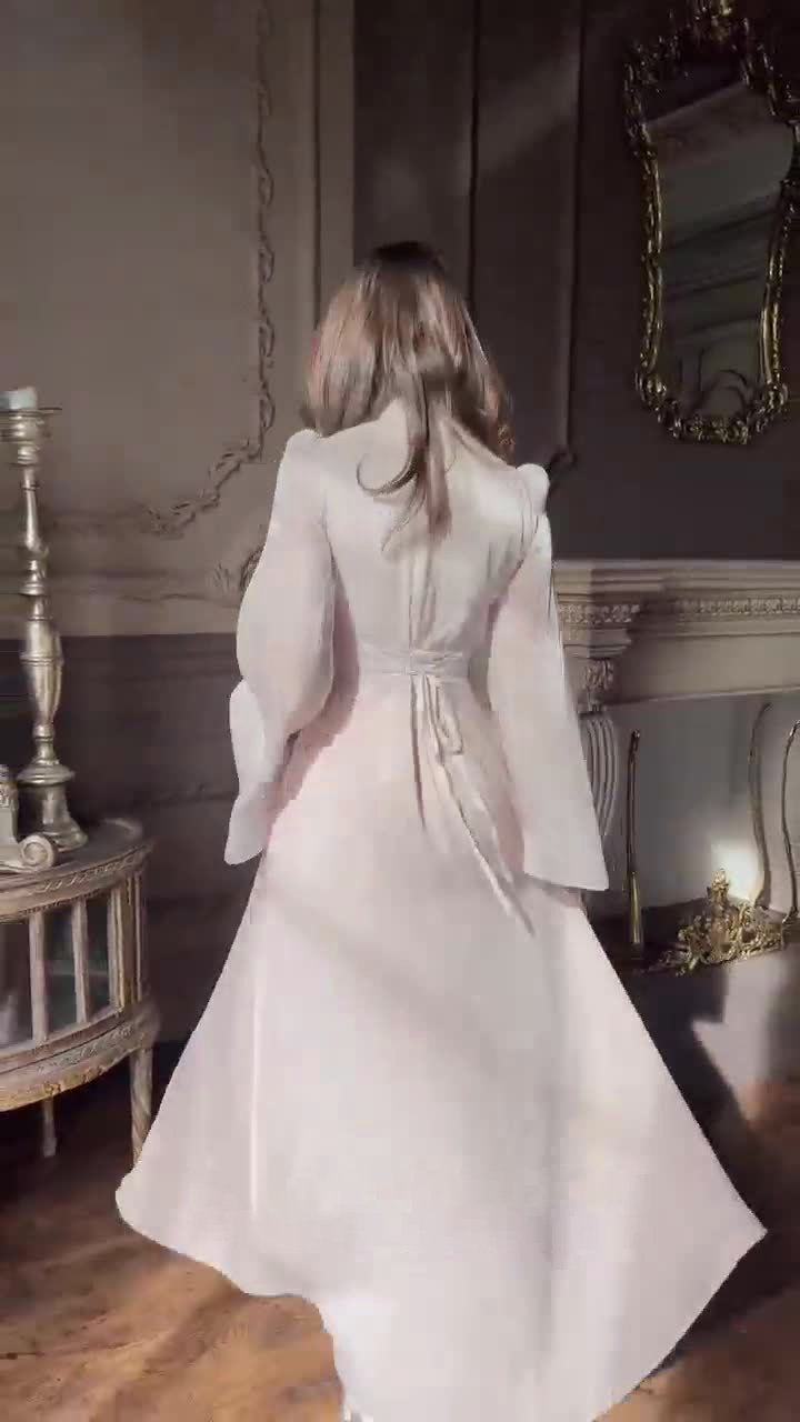 For the bride: The light color is gentle and understated, and the lustrous fabric adds a touch of elegance. The cinched waist and slits, along with the lantern sleeves, flatter the figure. Suitable for both Chinese and Western weddings, it's both elegant and photogenic when toasting, making it a striking, lightweight dress choice, especially suitable for spring and summer weddings.