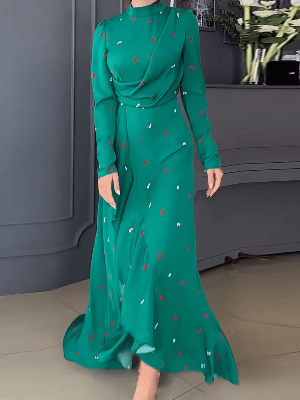 Printed Bell Sleeves Waist Draped Satin Maxi Dress-Clearance