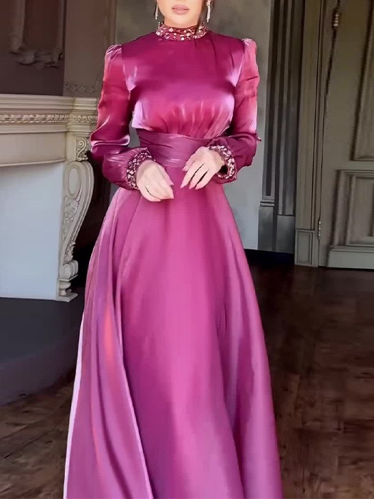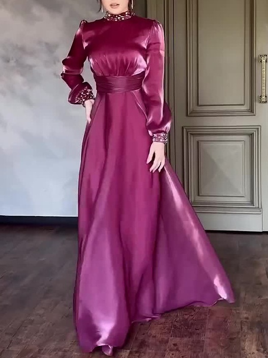 Fit: The overall slim-fitting, long dress silhouette conforms to the body, accentuating the woman's figure and showcasing her elegant figure.