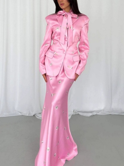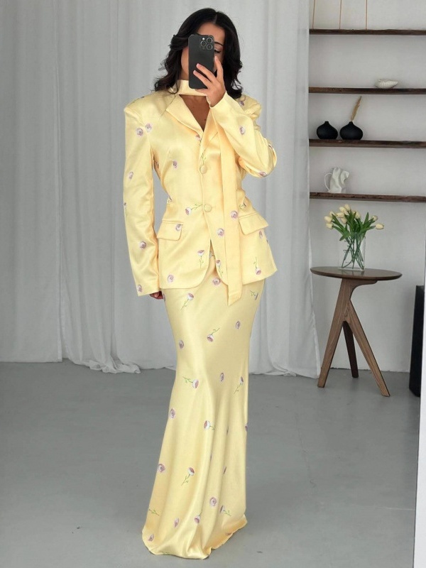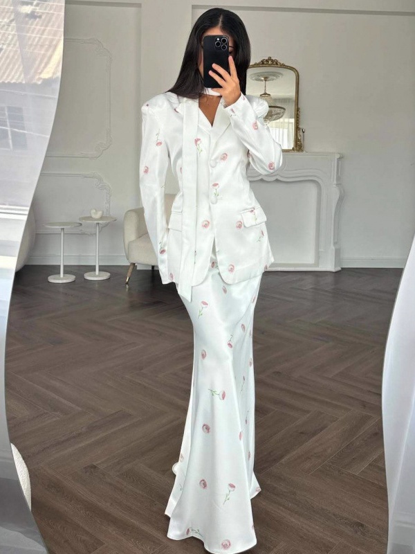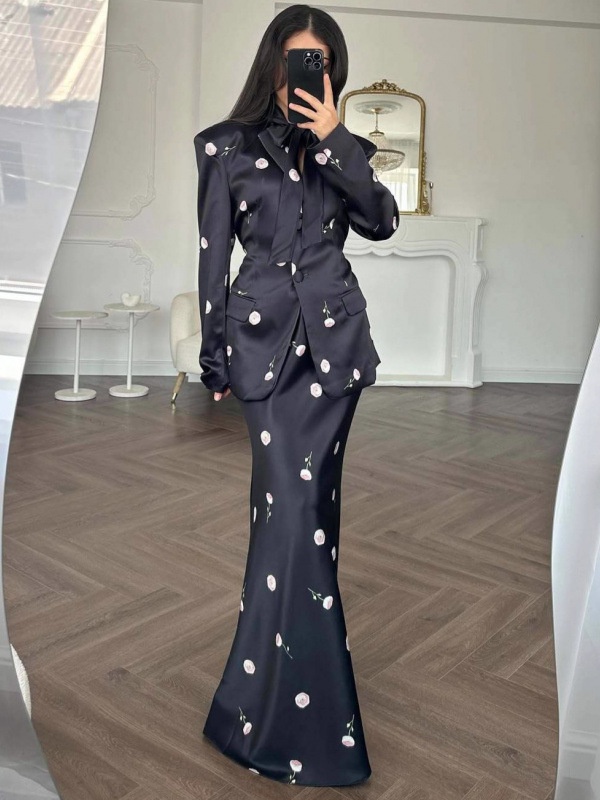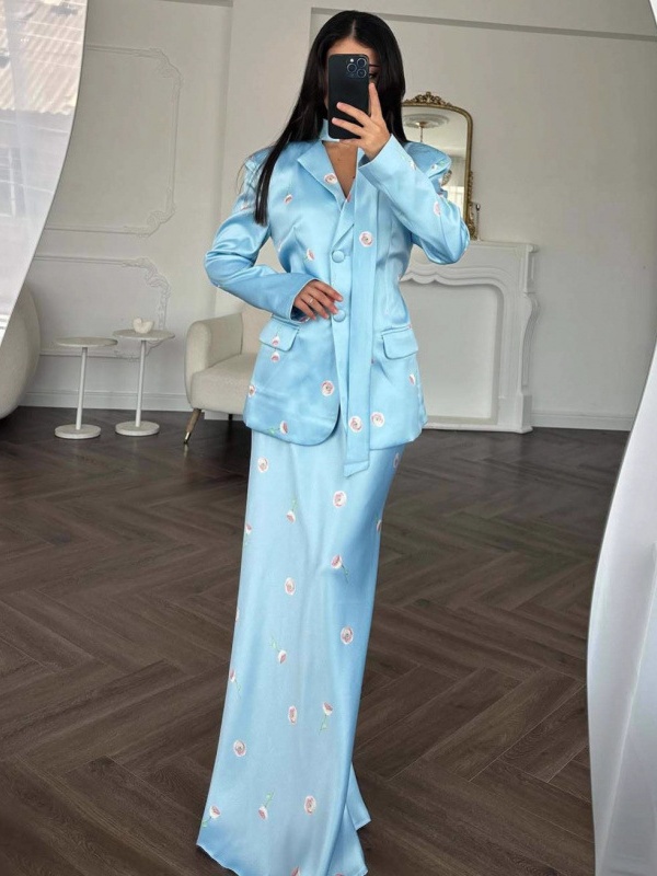 2Pcs Plant And Floral Printed Suit Jacket+Dress Set