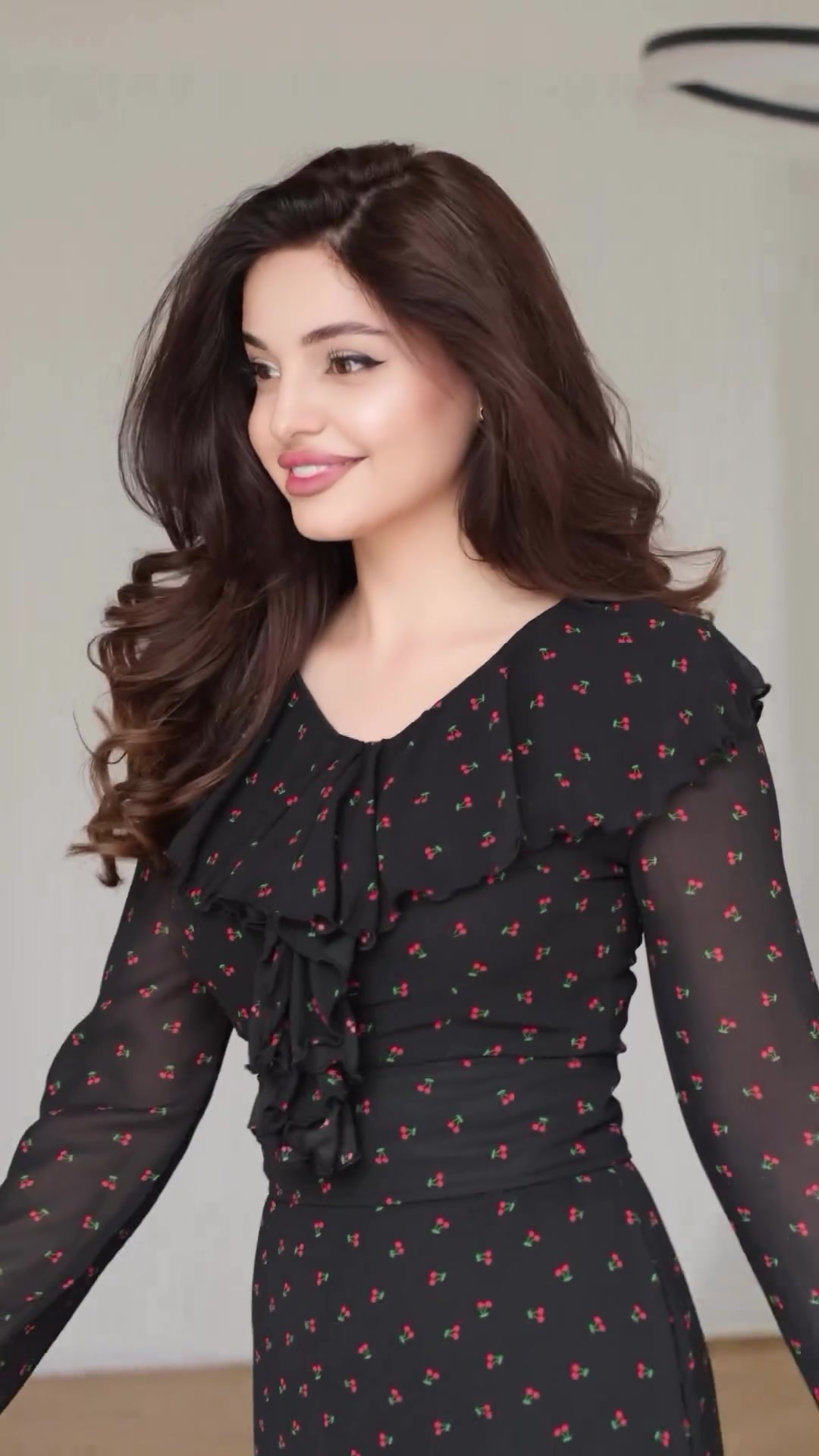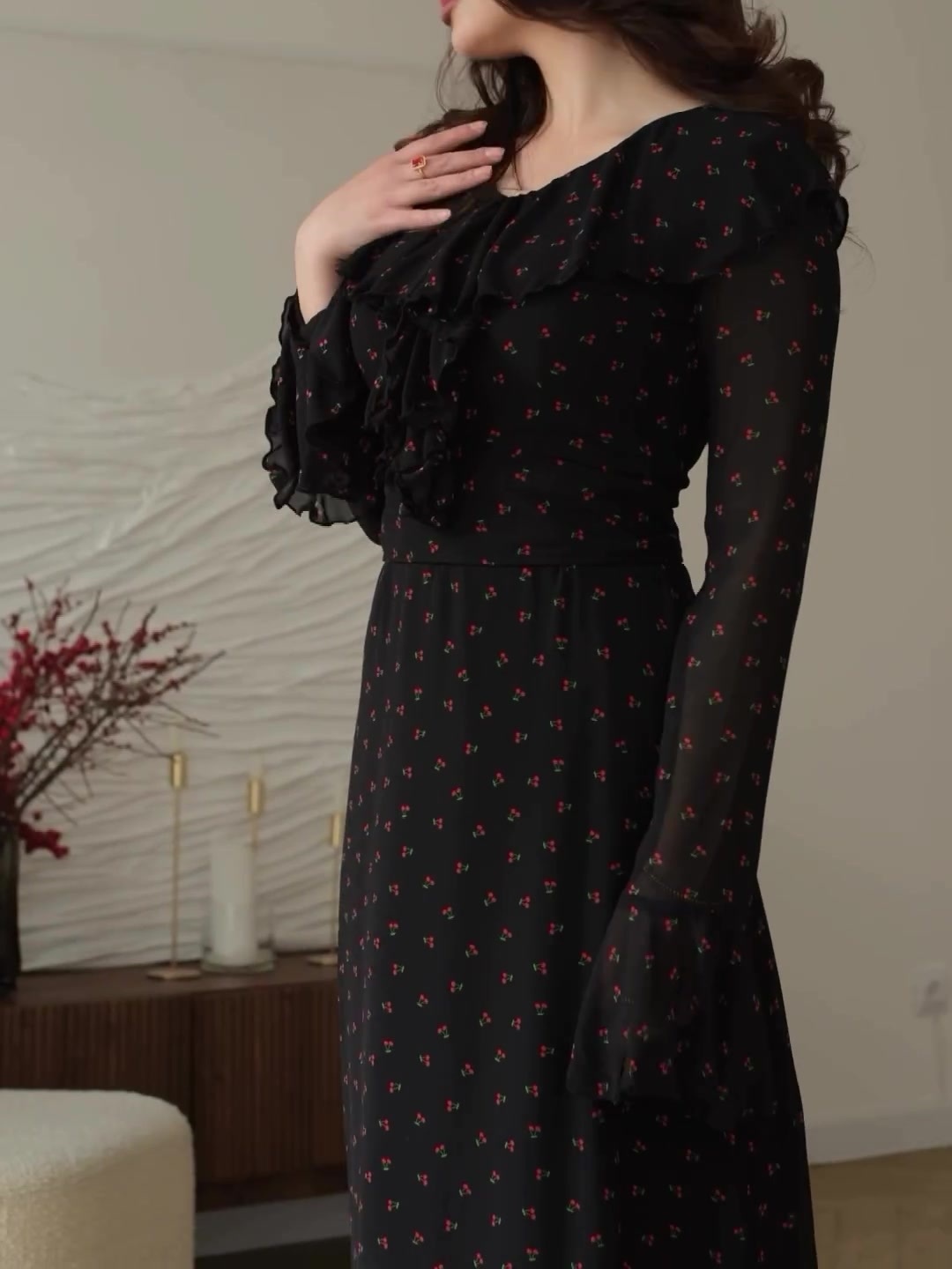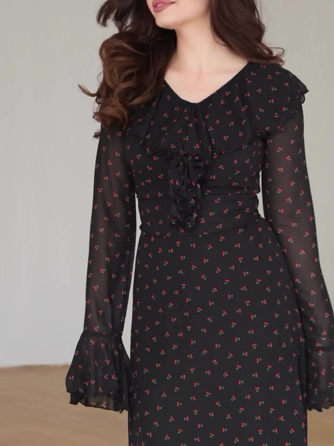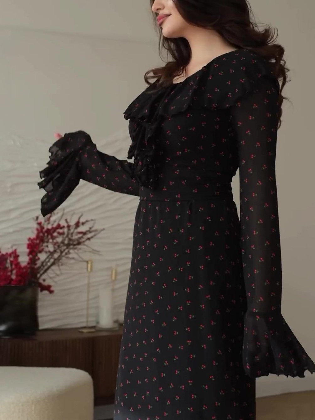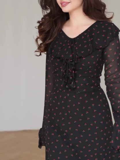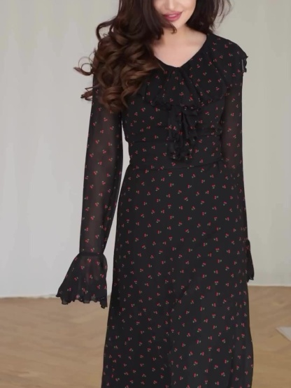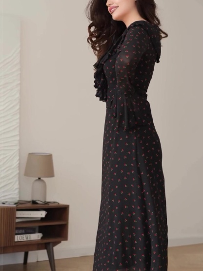 Chiffon Printed Lotus Leaf Sleeves Maxi Dress