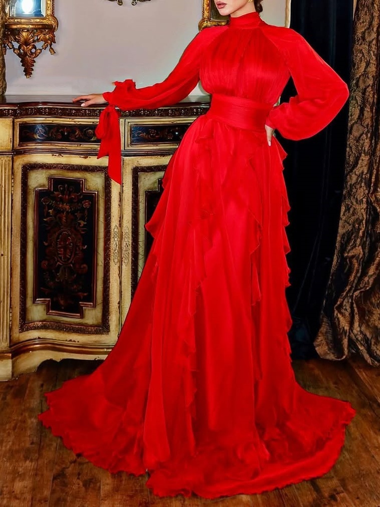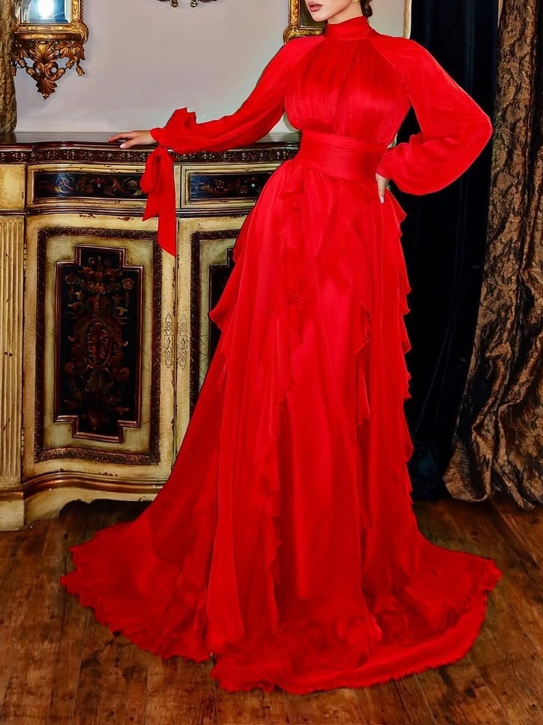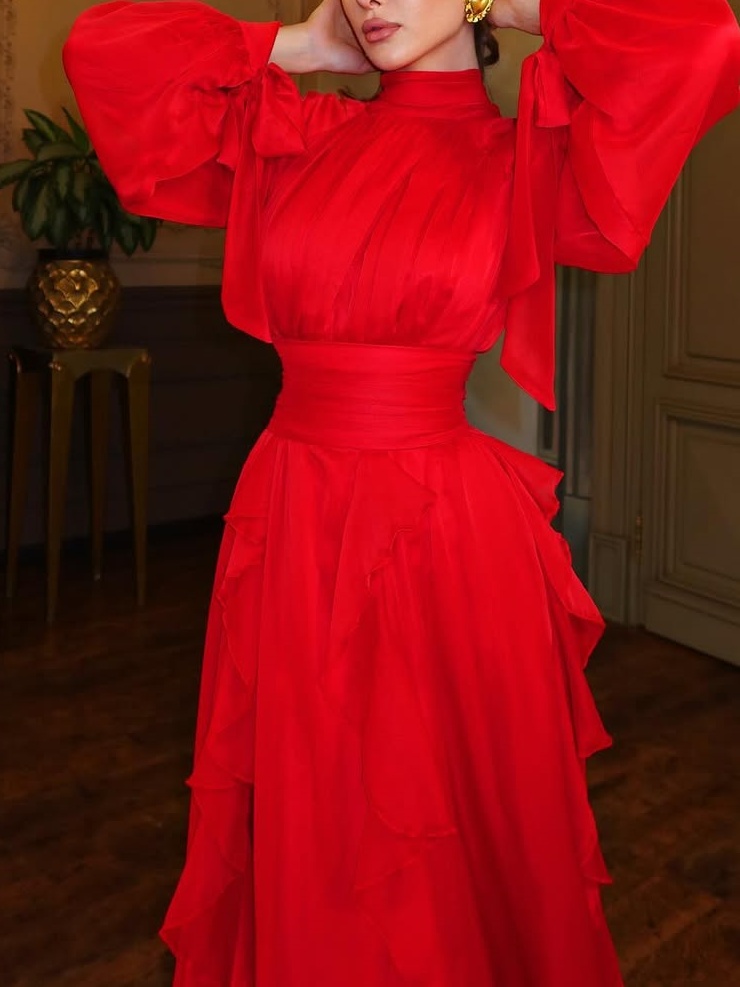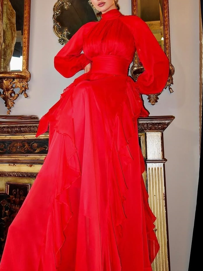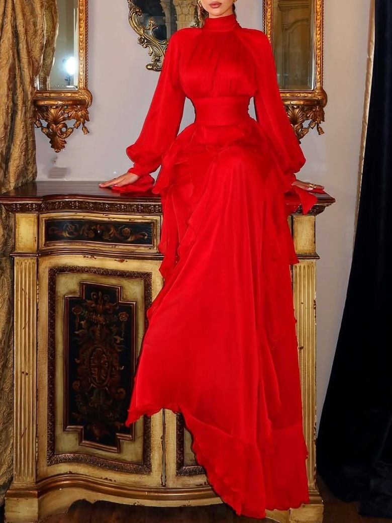 Layered Pleats + Full Skirt: The top features a fitted waist, high collar, and flared sleeves, emphasizing the waist and neckline for a refined look. The tiered, ruffled skirt adds layered and dynamic beauty through irregular pleats, which naturally scatter as you walk, concealing any figure. It flatters a variety of body types and enhances a romantic and relaxed feel.