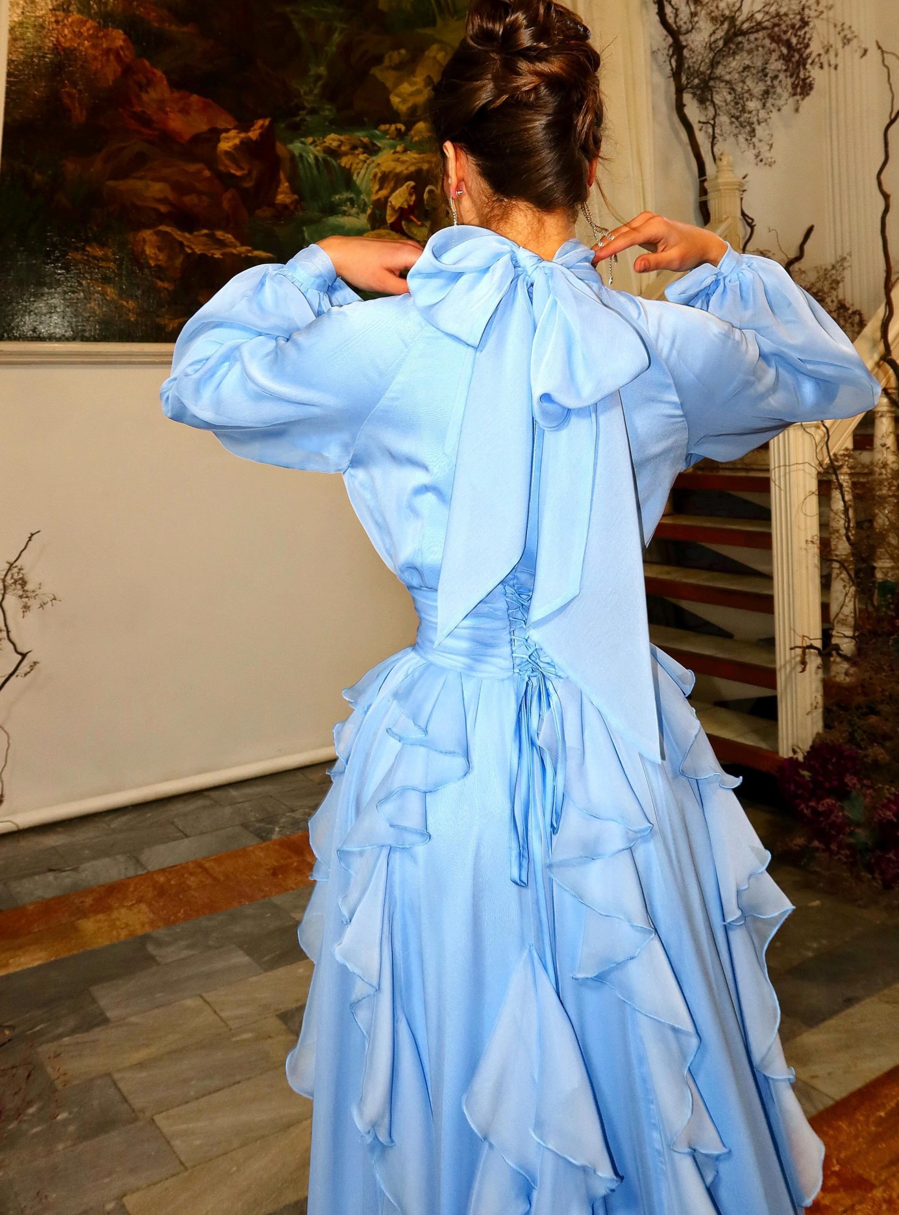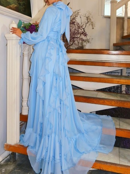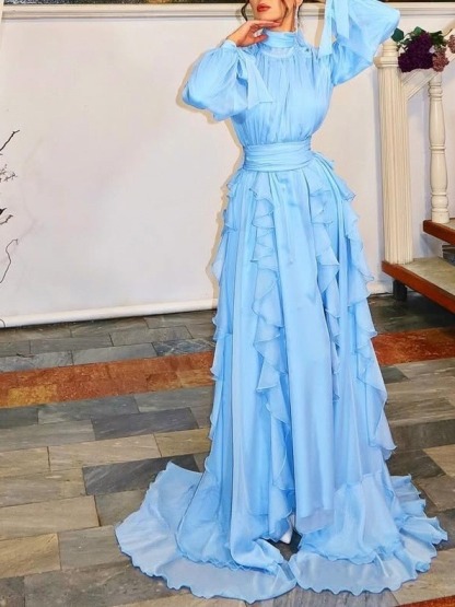 Combining elegance and formality with romantic artistry, the light blue color creates a refreshing atmosphere. The high collar and fitted waist ensure a dignified look for formal occasions, while the layered pleats and full skirt lend a romantic and relaxed feel. Wearing it creates the illusion of a "princess from a fairy tale," perfect for a variety of occasions and a memorable moment.