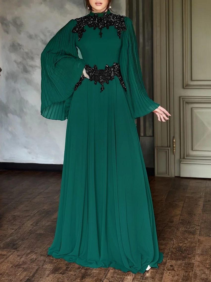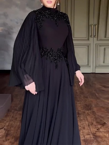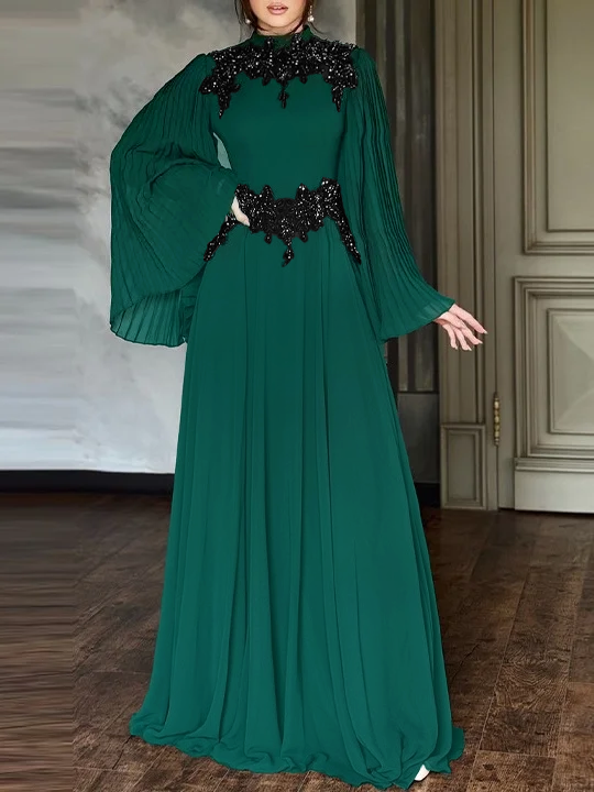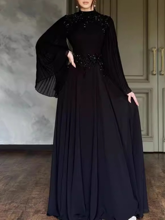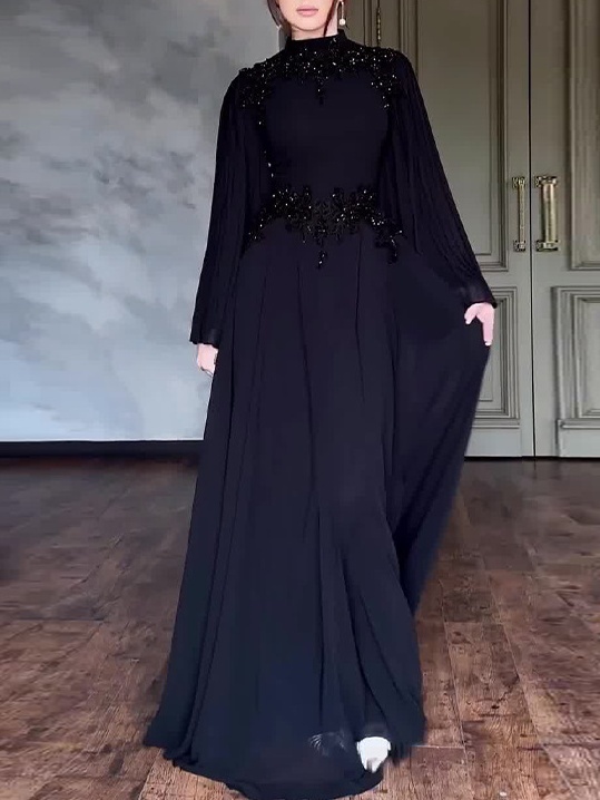 Combining elegance and romance, high collar, waist and large skirt meet the needs of formal occasions, embroidery and beading and trumpet sleeves give the skirt artistic and romantic sense, wearing it is both dignified and elegant, without losing the feminine beauty.