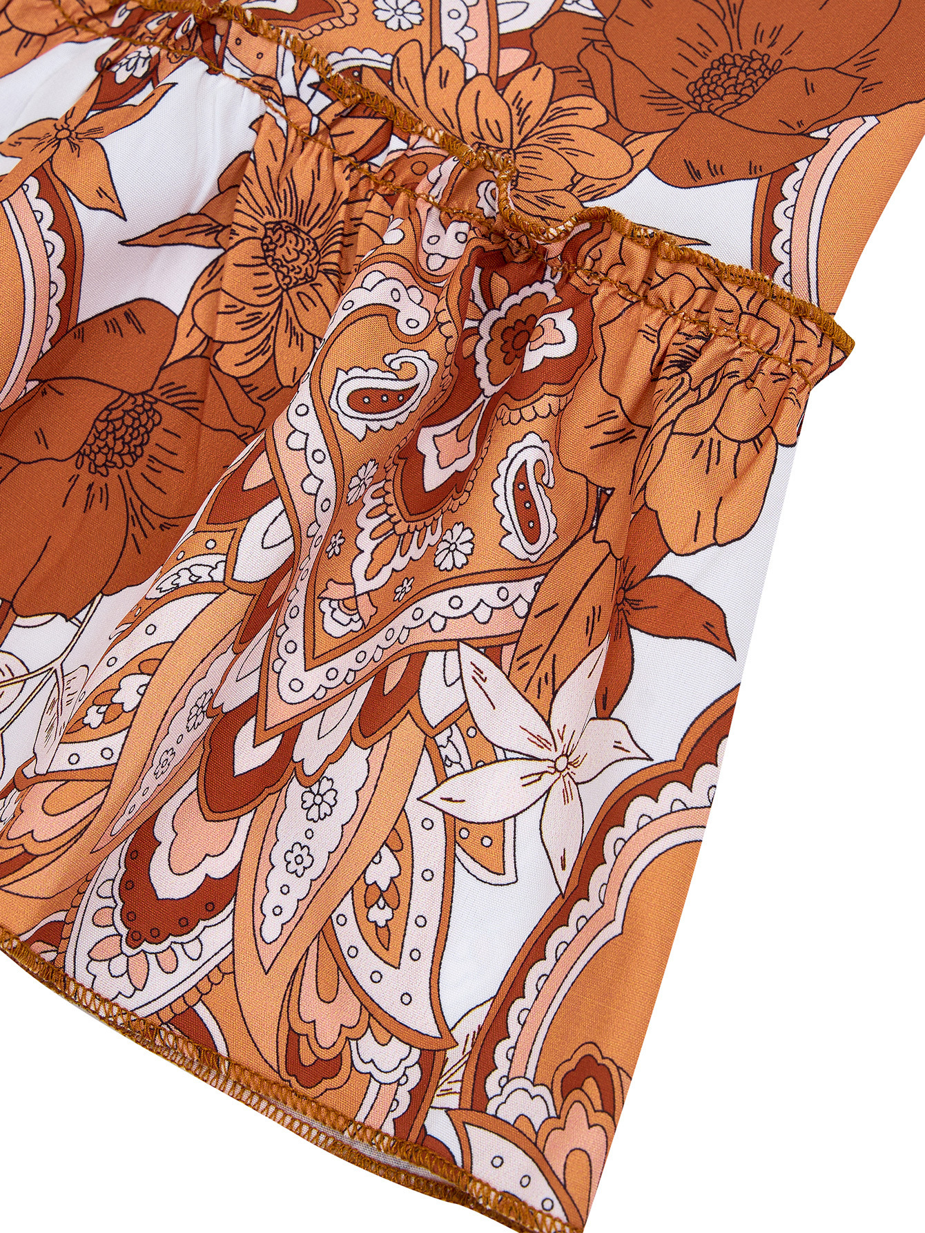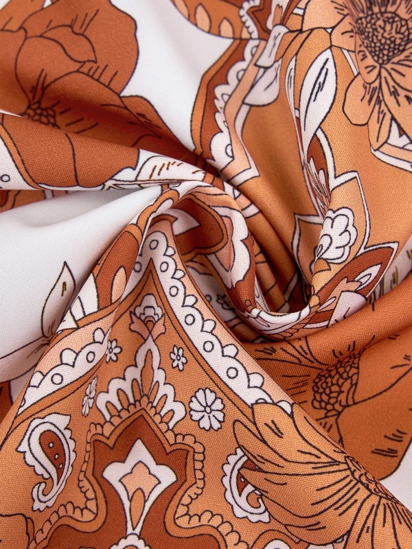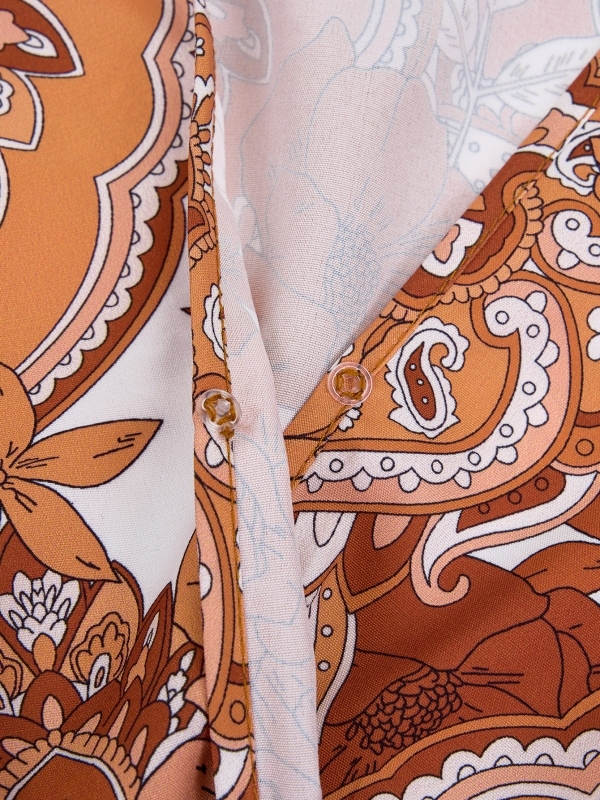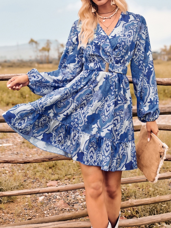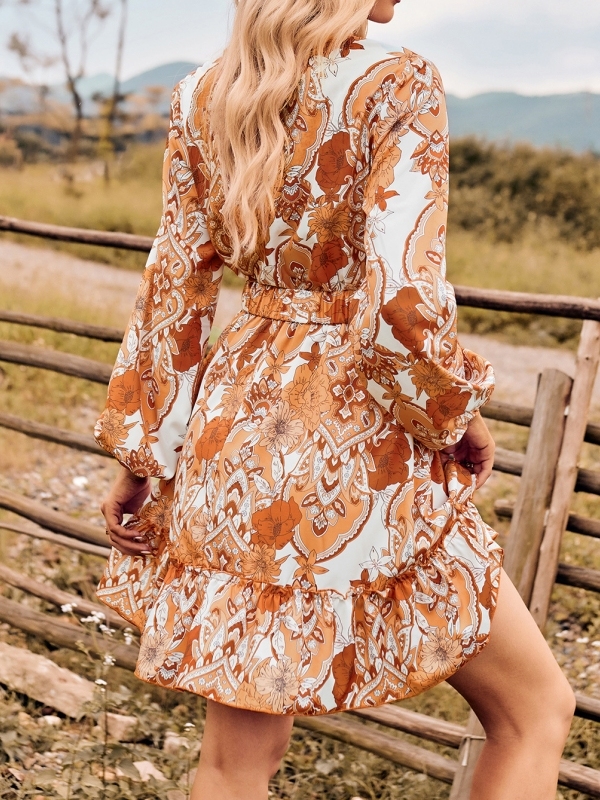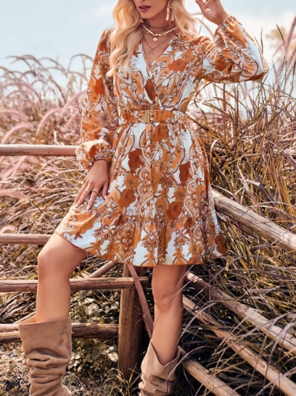 Geometry and Floral Graphics V-Neck Waist Dress Set
