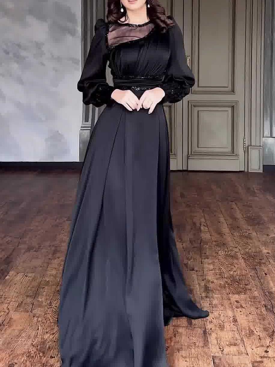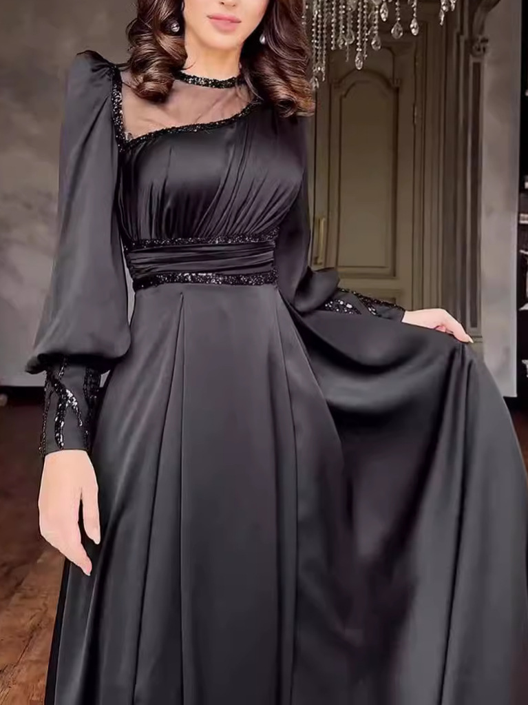 Details: Sequins and rhinestones embellish the neckline and waist, adding a touch of opulence to the all-black dress. Like "starlight in the dark night," they are understated yet eye-catching, serving as the finishing touch and enhancing the dress's sophistication.