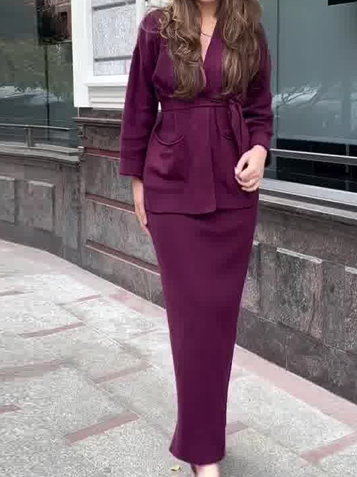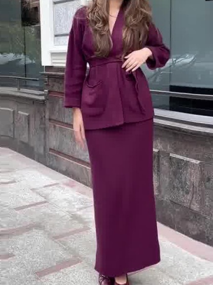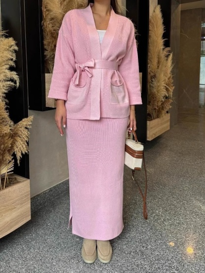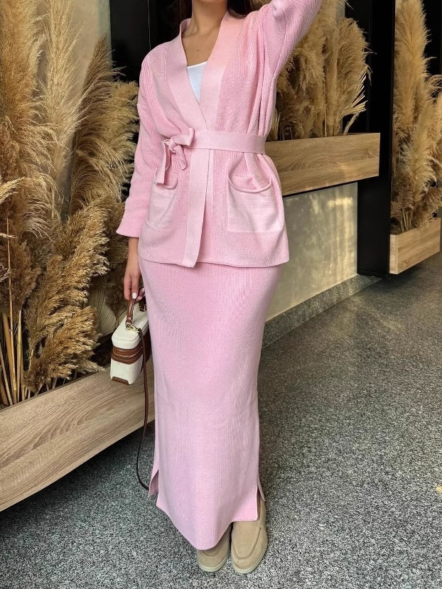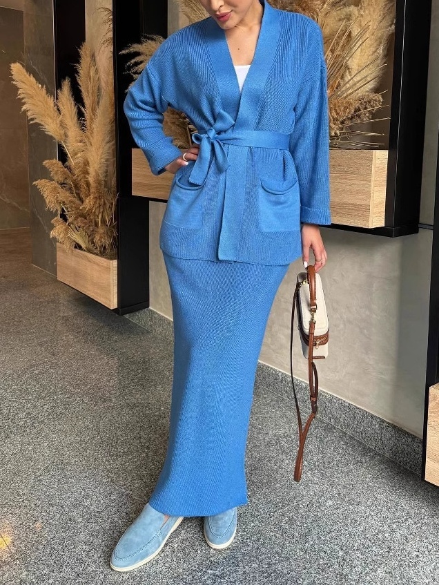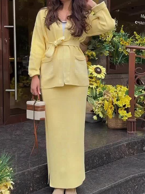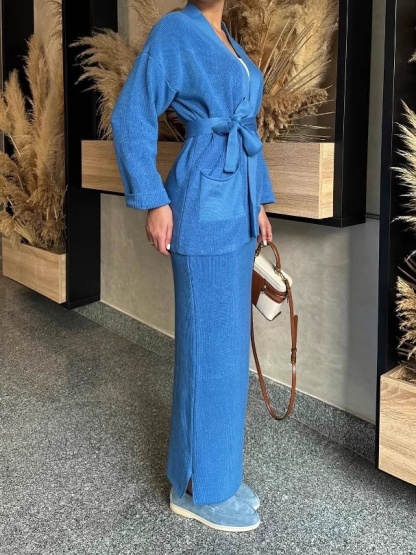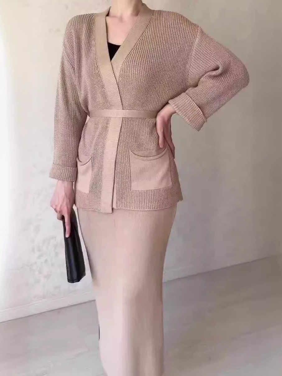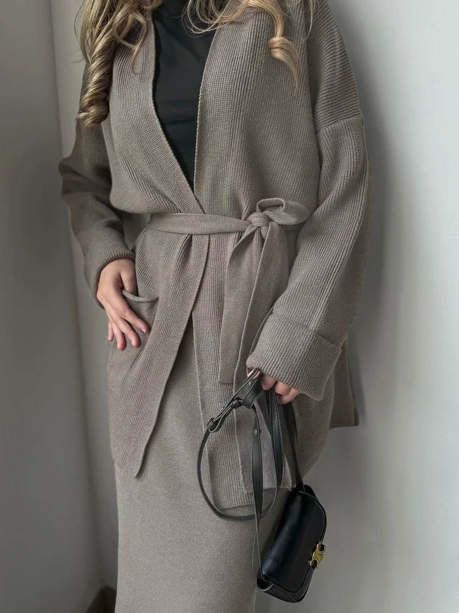 Knitted Lace-up Long Sleeve Cardigan Long Dress Set