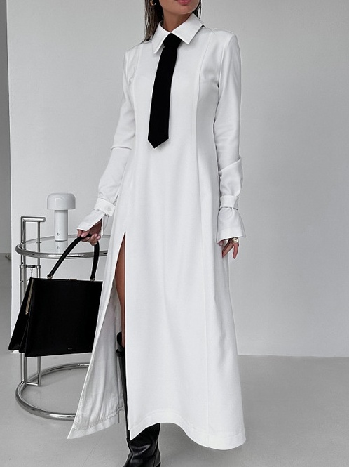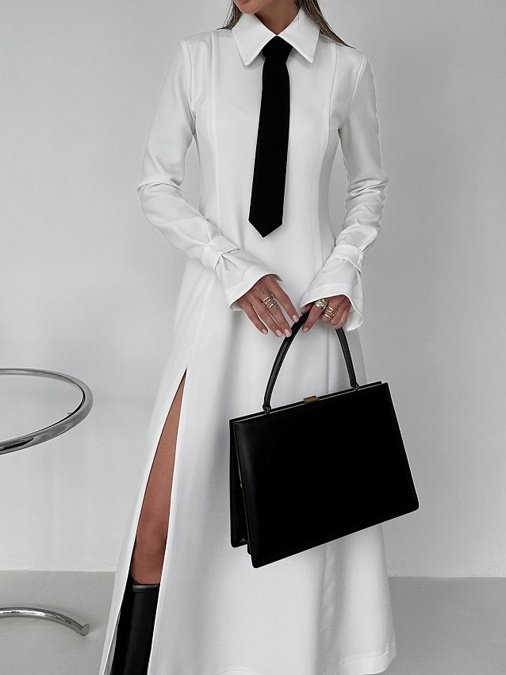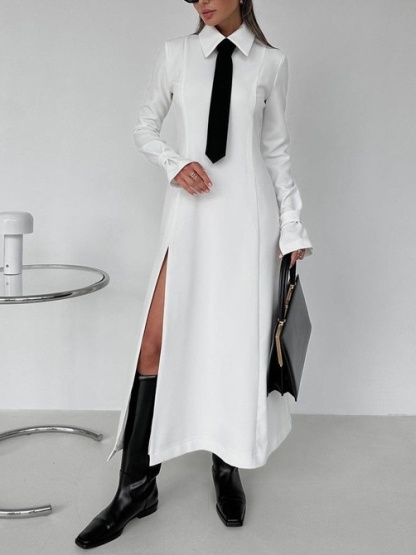 Lapel Long Sleeve Split Dress Tie Long Dress