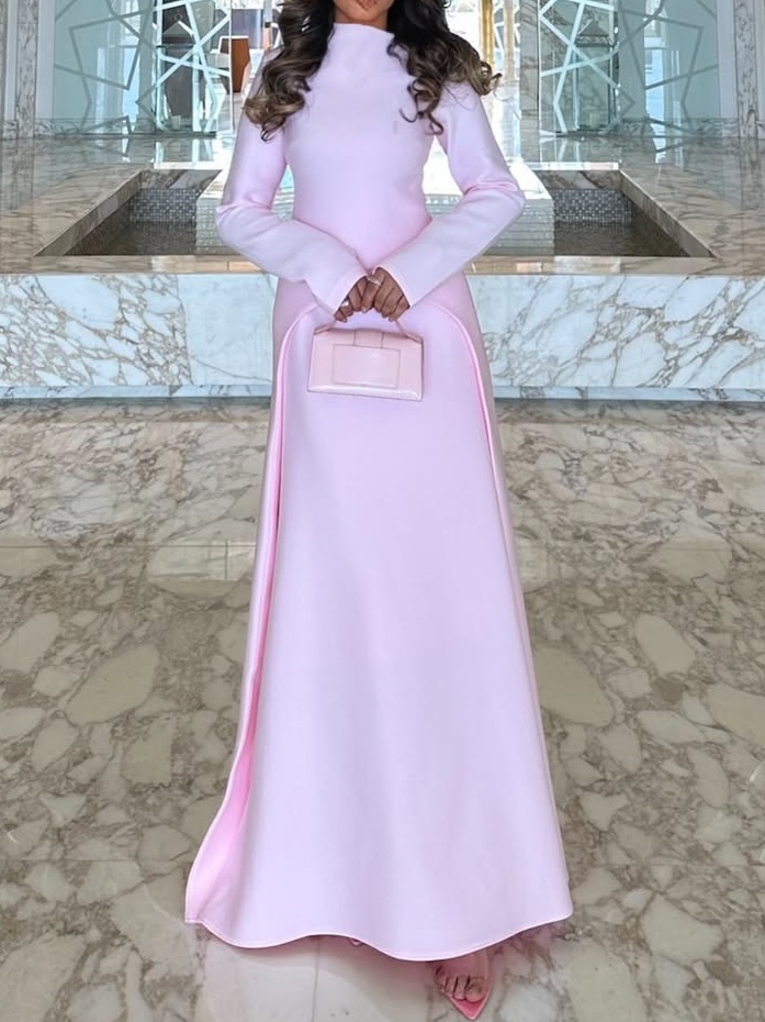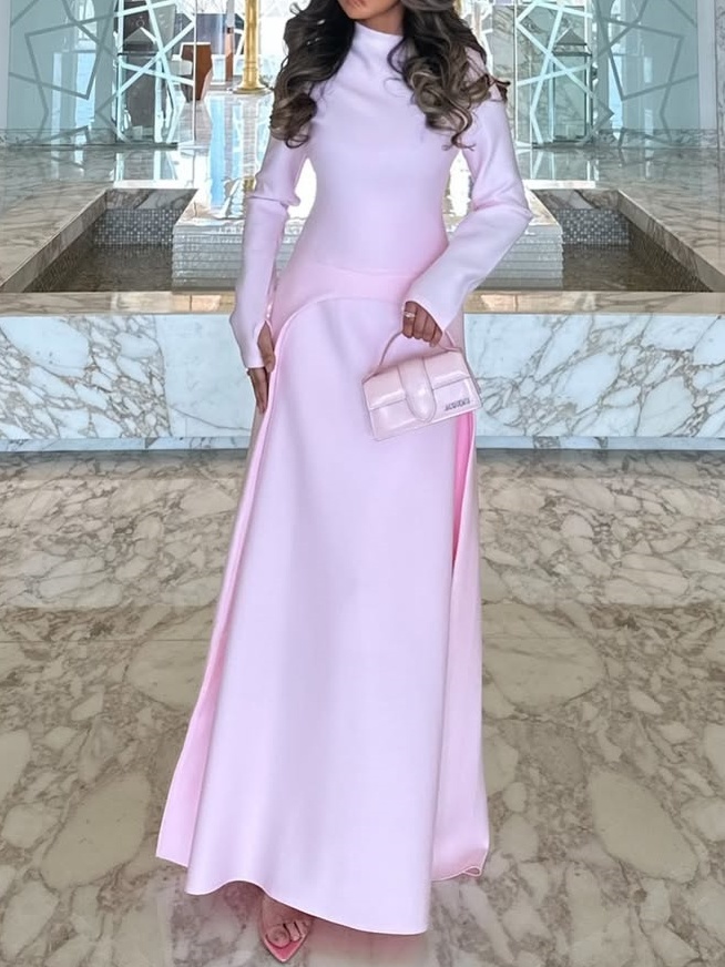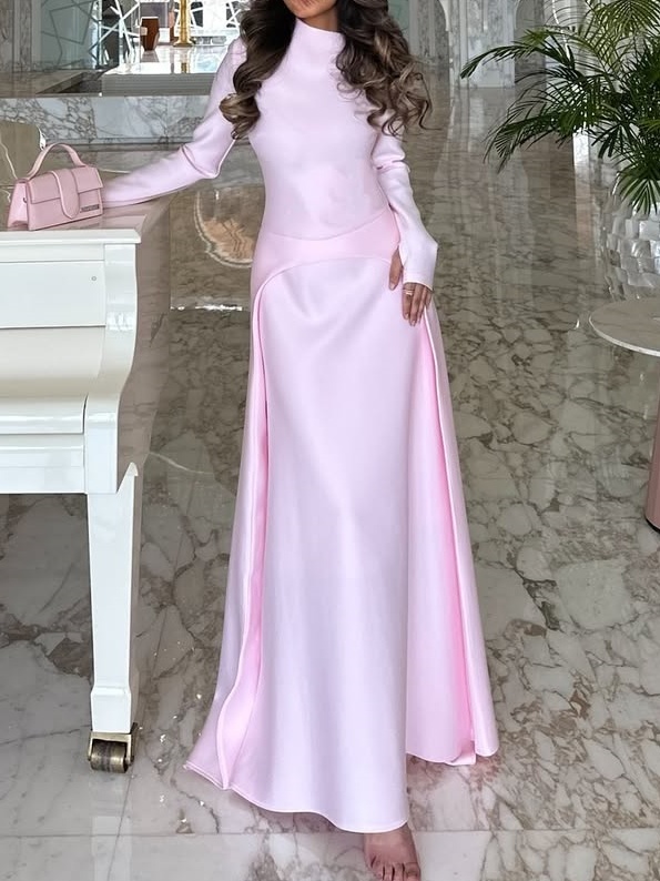 Tailoring and Details: The high neckline and long sleeves flatter the neck and arms, adding a touch of elegance. The slit waist and three-dimensional tailoring create a visual focal point, optimize the waist-to-hip ratio, and enhance the slim-fitting dress's layered look. The skirt flows naturally with walking, showcasing a dynamic aesthetic.