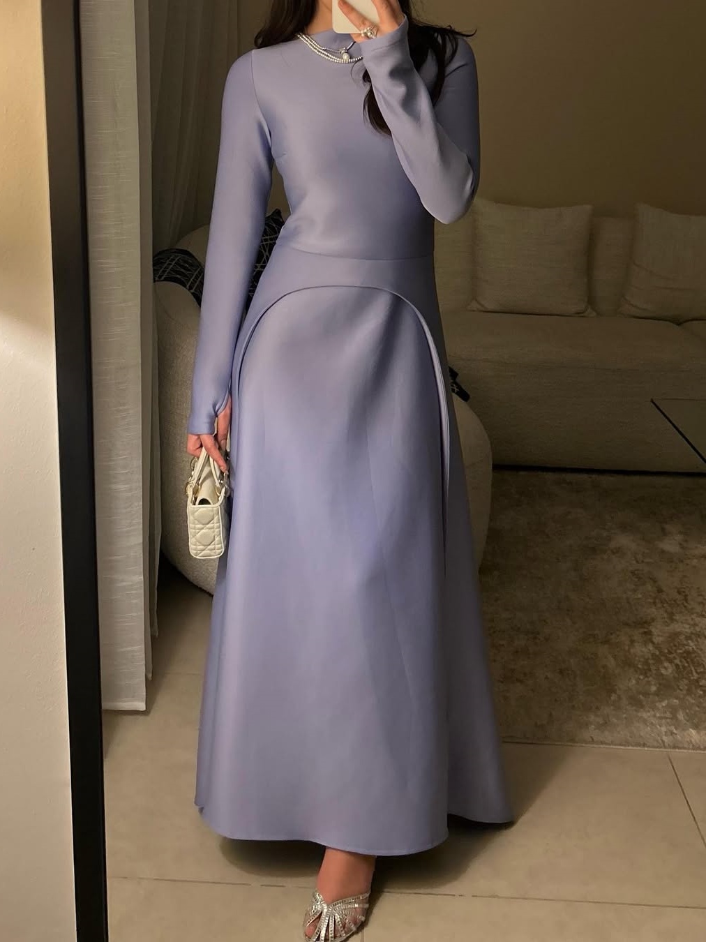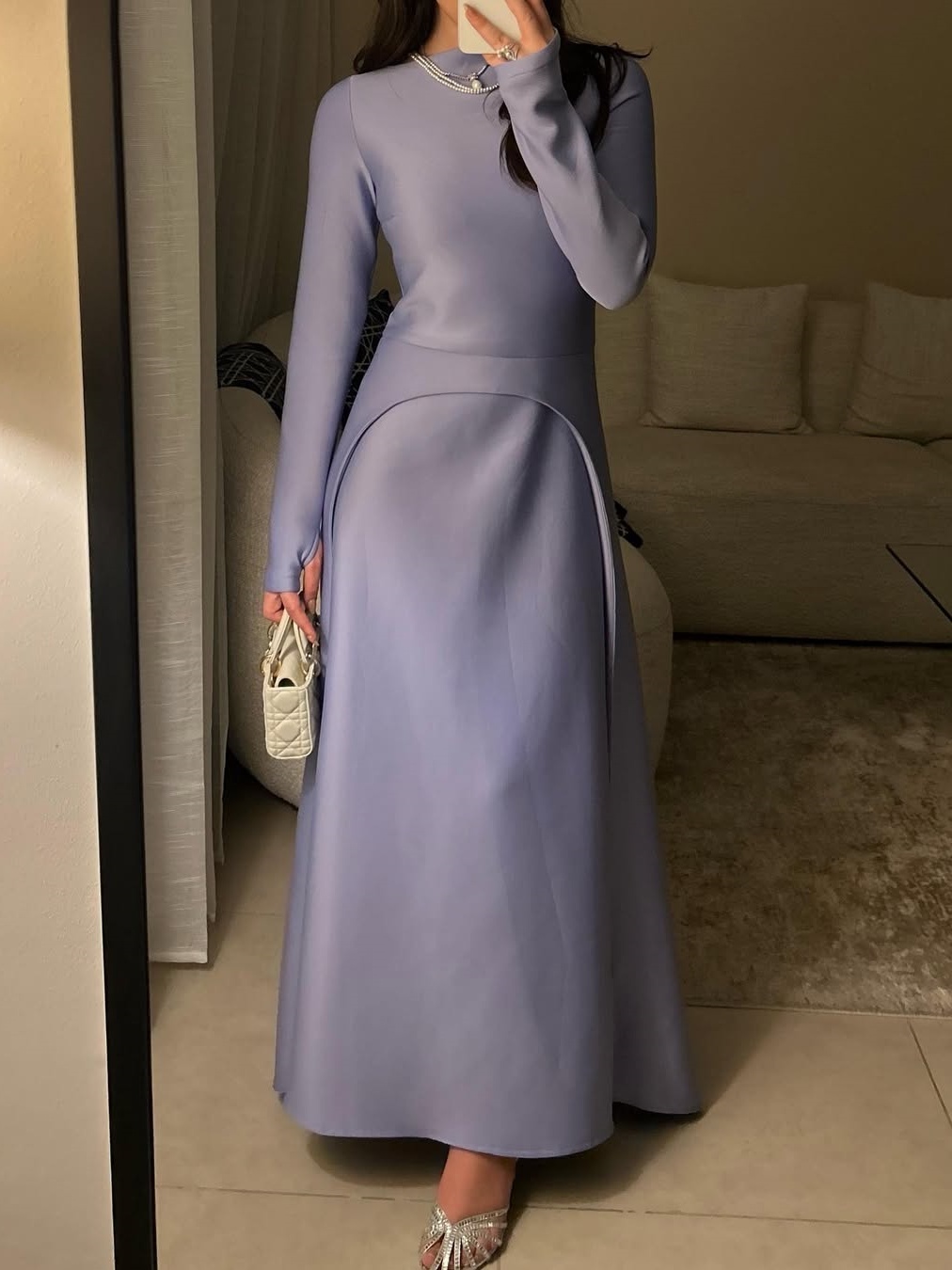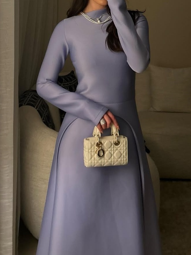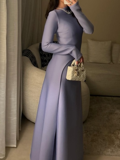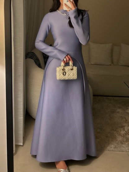 For fall and winter art exhibitions and theater performances, the dress's gentle elegance perfectly complements the artistic atmosphere. The high neckline, long sleeves, and split line create an extension of the art installation, while the light purple color echoes the exhibition theme or the romantic atmosphere of the theater. Wearing this dress to exhibitions and performances evokes a sense of artistic elegance, making it a perfect choice for cultural and artistic occasions.