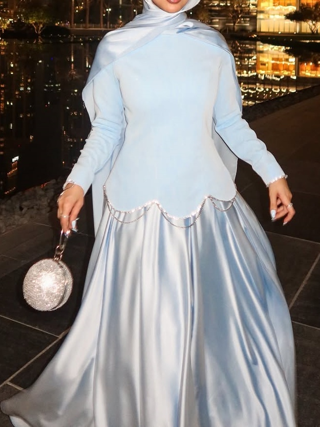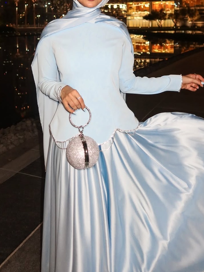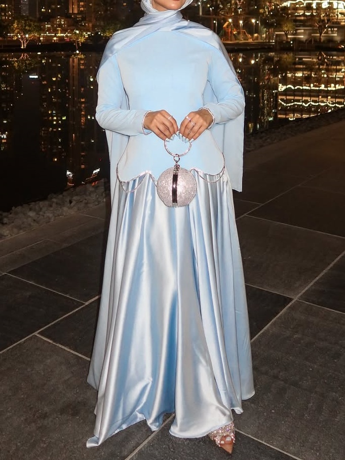 Style and Elegance: The dress blends elegance, grace, and fashion, meeting the appropriate degree of coverage required by specific cultures or religions while showcasing the wearer's stylish taste and personal charm through its refined design and color palette.