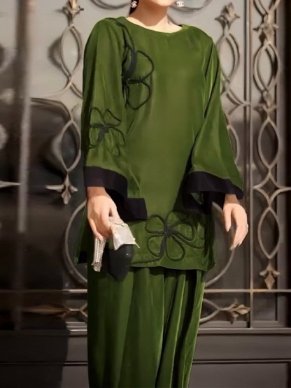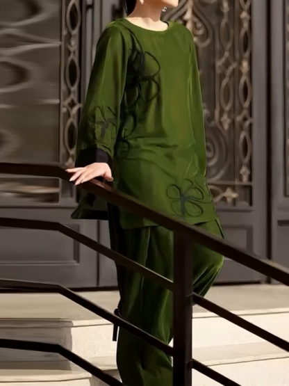 Fit: The top features a loose-fitting silhouette with a simple, elegant round neckline that flatters the neckline. The long sleeves and wide cuffs, reminiscent of lantern sleeves, add a sense of layering and a retro vibe, enhancing the look with movement. The pants also feature a loose, wide-leg fit, which perfectly flatters the legs, creating a slender, elegant look while also providing comfort.